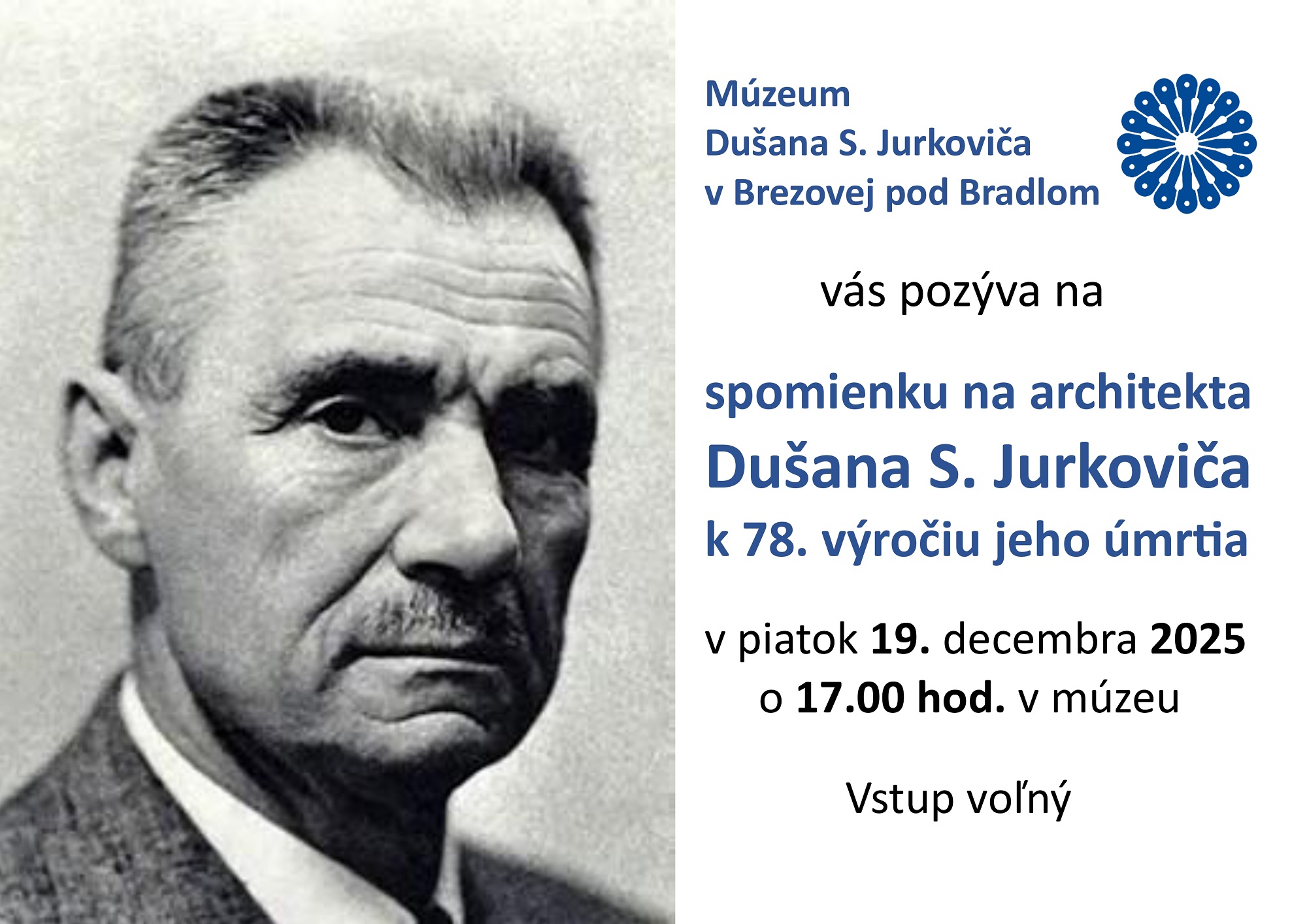 Múzeum D. S. Jurkoviča vás srdečne pozýva na spomienku na architekta Dušana Samuela Jurkoviča k 78. výročiu jeho úmrtia. V piatok 19. decembra 2025 o 17.00 hod v múzeu, vstup voľný. Tešíme sa na vašu návštevu!